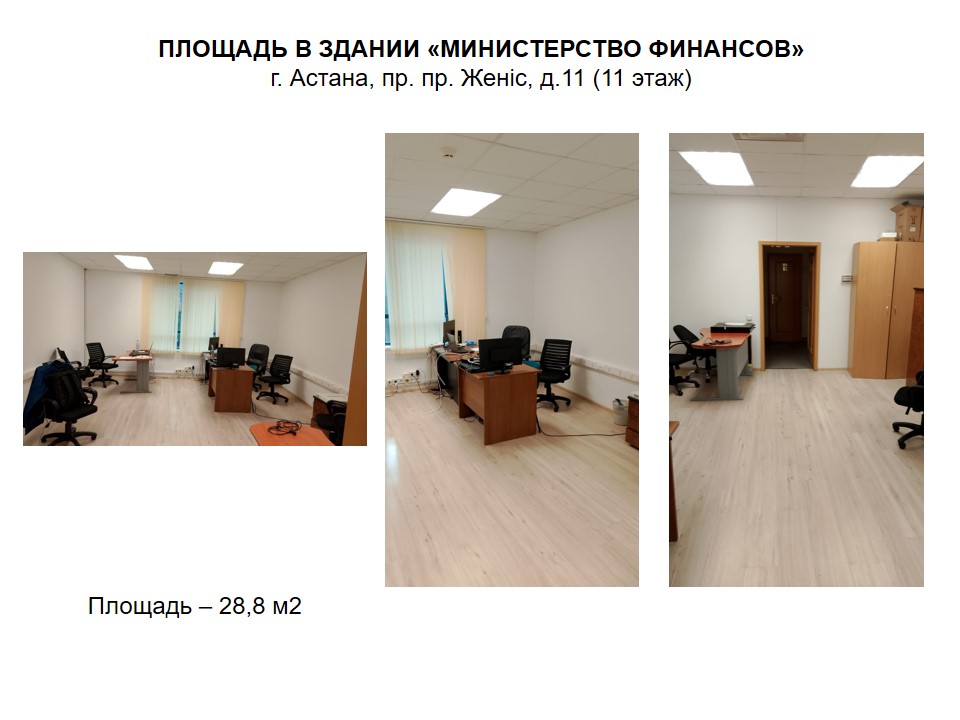 Недвижимость (Помещение в здании) Площадь (28,8м2) в здании Министерство финансов (пр. Женис,11) офисное, имеются все коммуникации, встроено-пристроенная часть Астана г.а., Сарыарка р.а., -